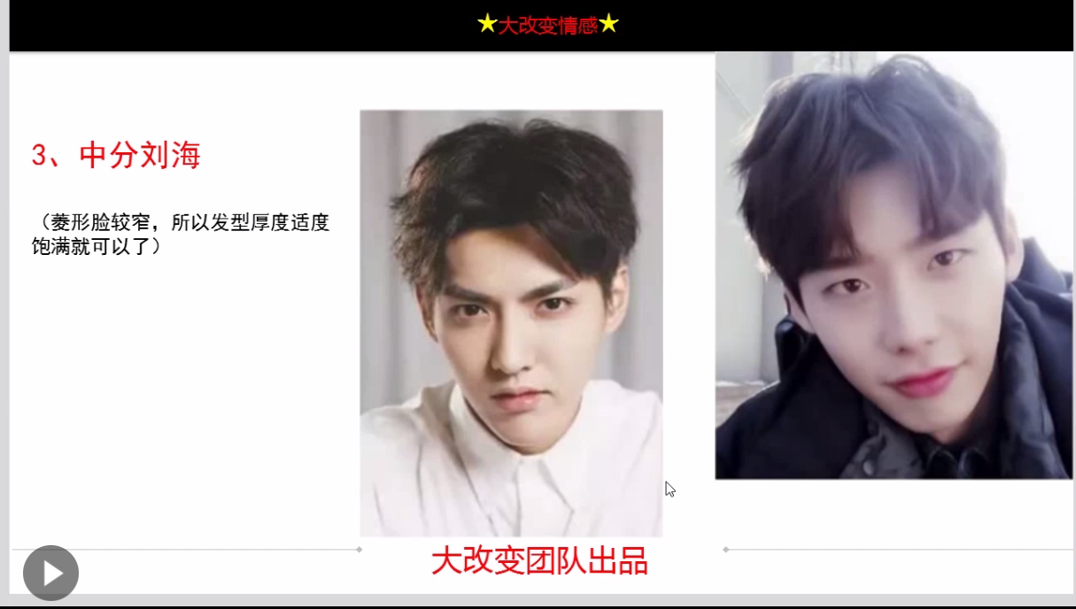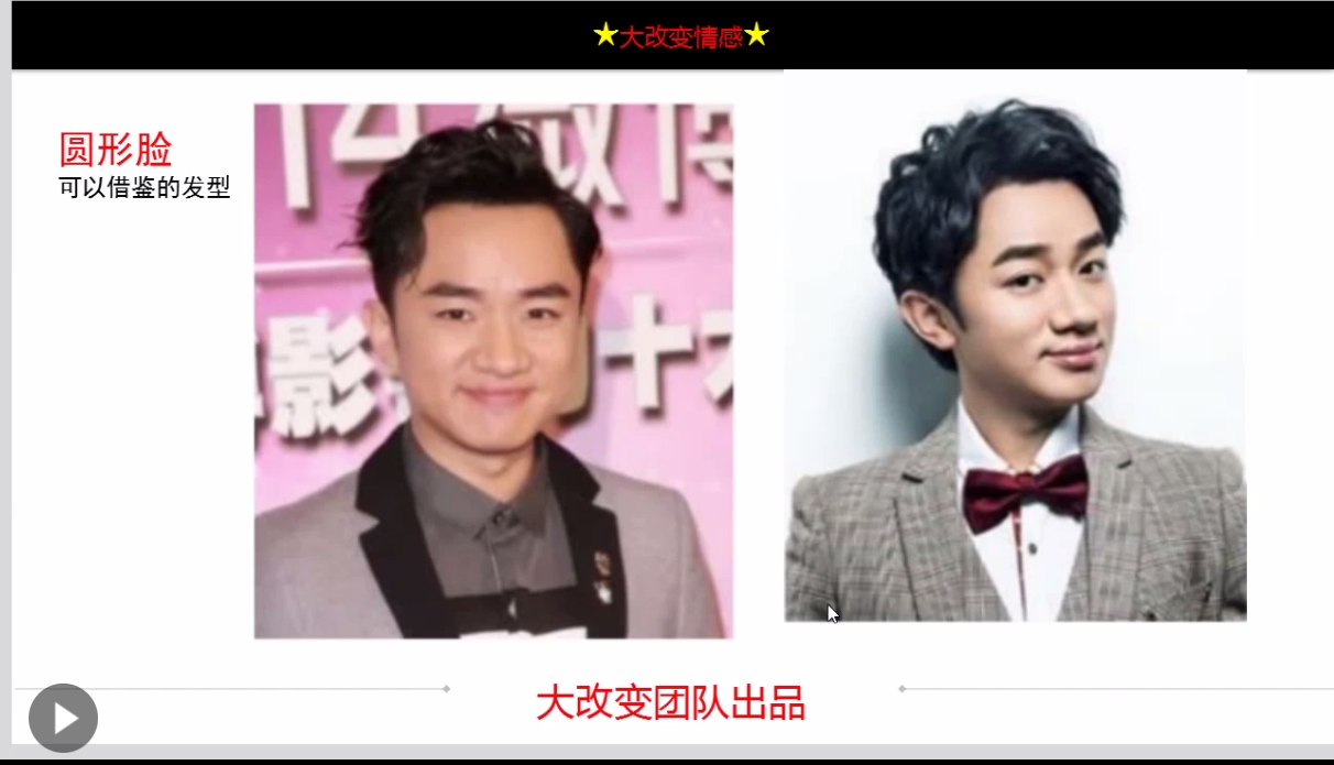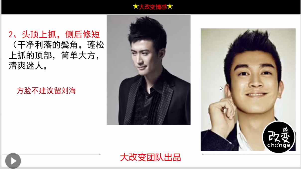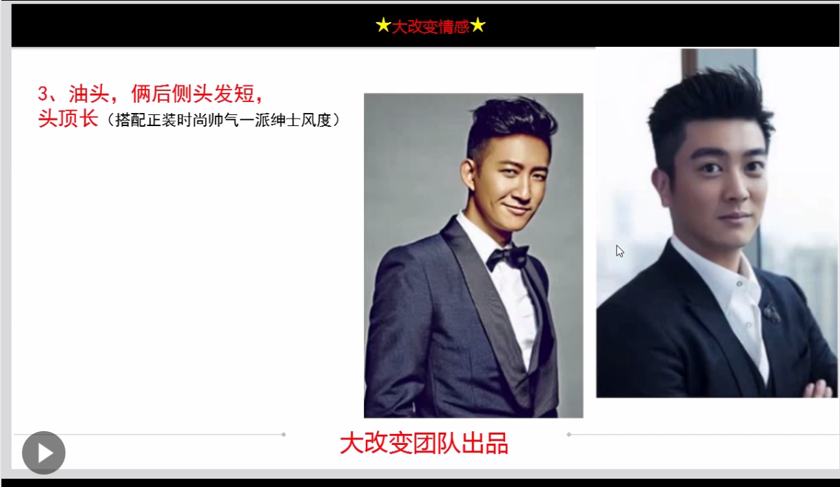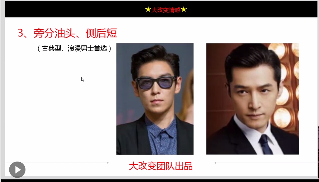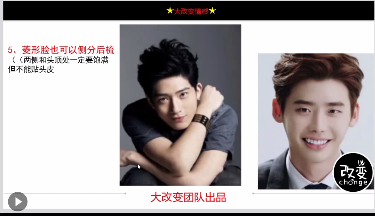 菱形脸也可以侧分后梳(两侧和头顶处一定要饱满,但不能贴头皮)
