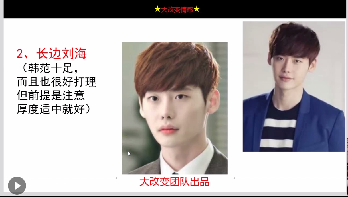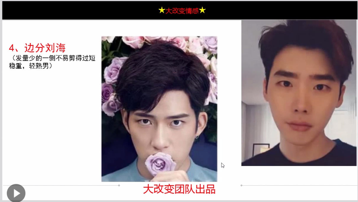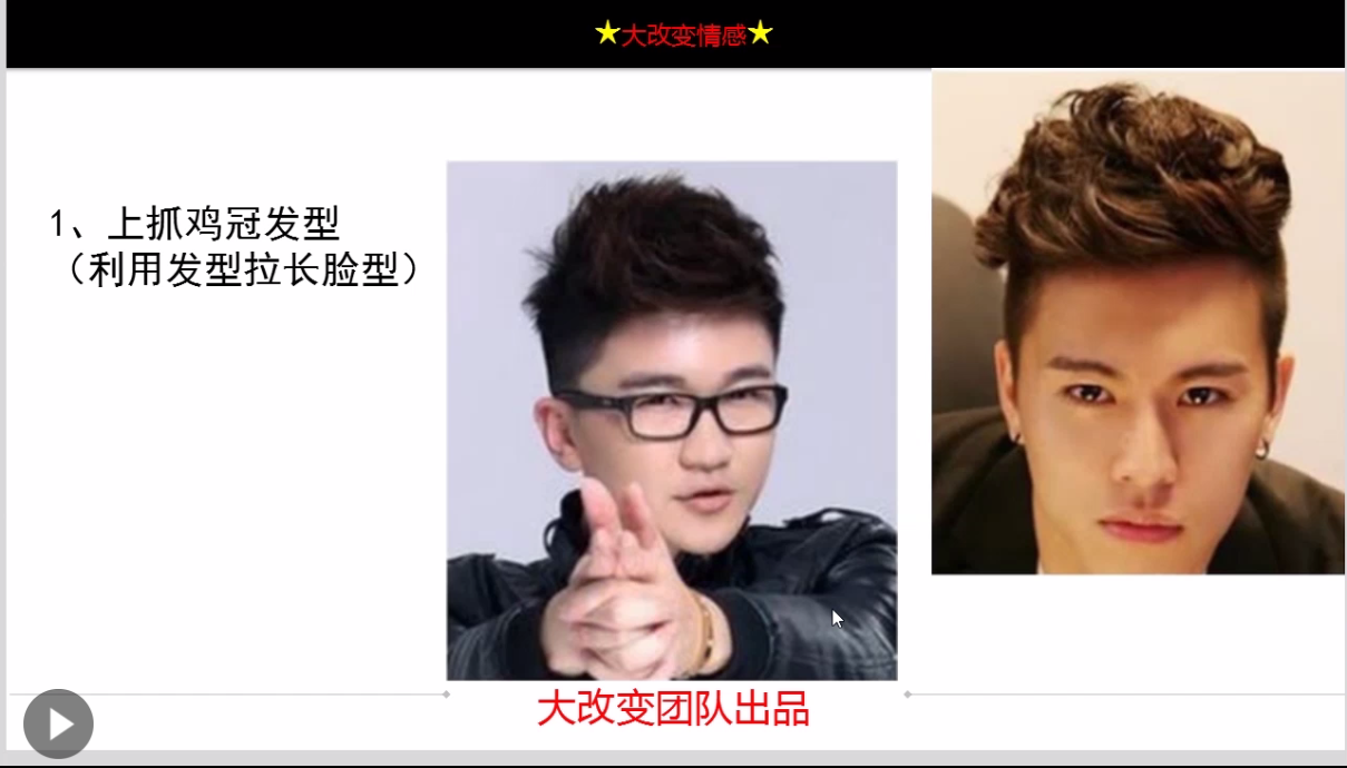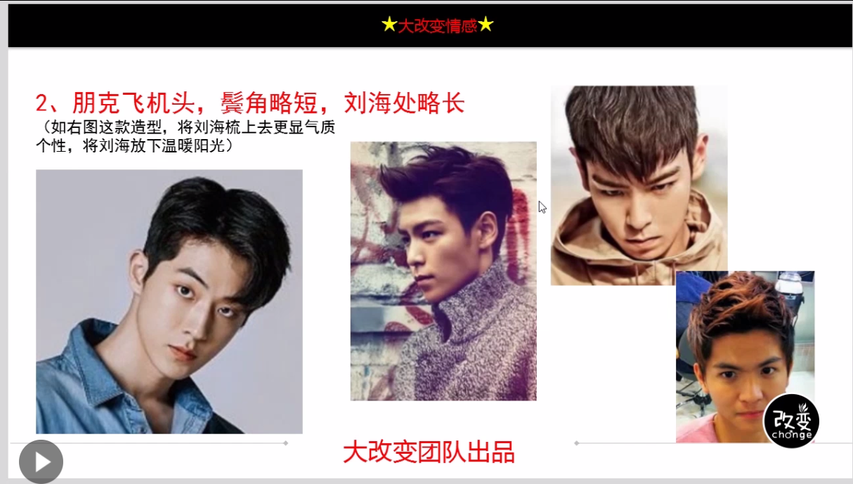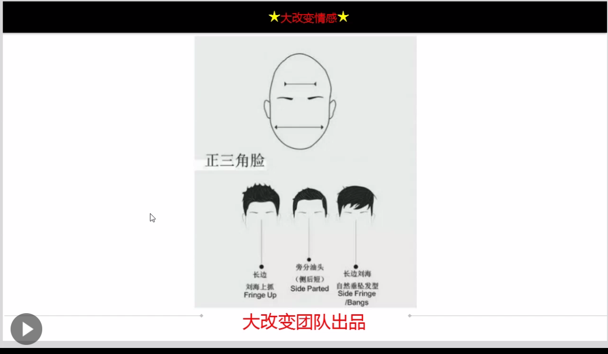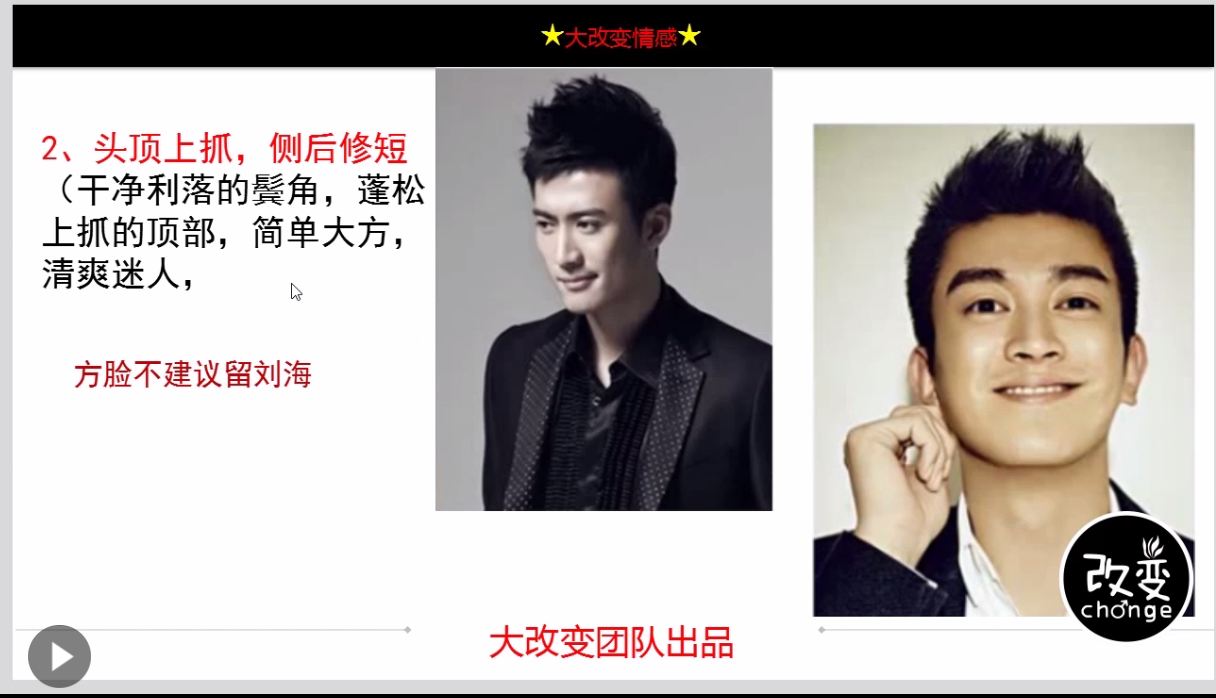 菱形脸也可以侧分后梳(两侧和头顶处一定要饱满,但不能贴头皮)