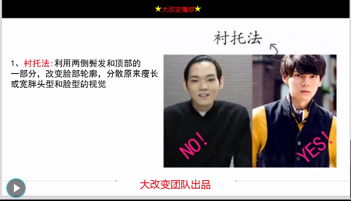 衬托法:利用两侧鬓发和顶部的一部分,改变脸部轮廓,分散原来瘦长或宽胖头型和脸型的视觉。