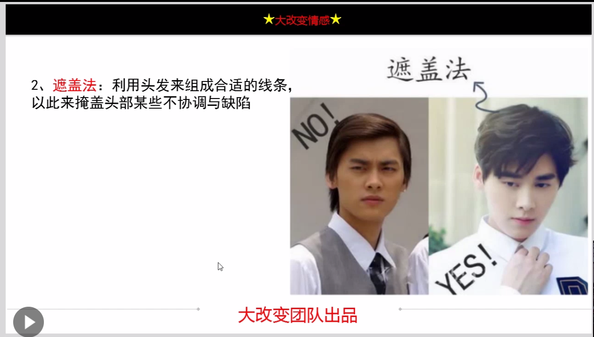 遮盖法:利用头发来组成合适的线条,以此来掩盖头部某些不协调与缺陷