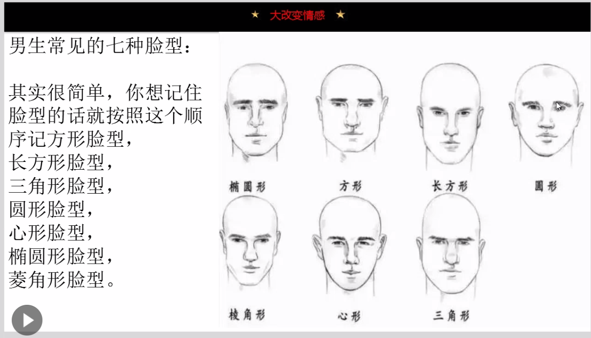 椭圆形:是男人中最完美的脸型(也称之为鹅蛋脸),这种比较标准的脸型很多发型都合适,并且能达到很和谐的效果。